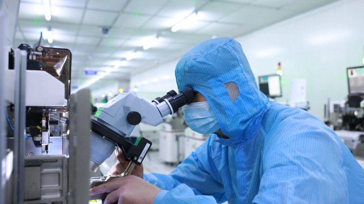 在无尘车间里,机器一刻不停运转着,操作人员正在进行装片。